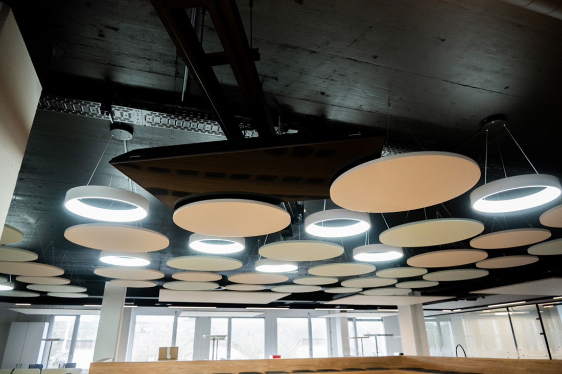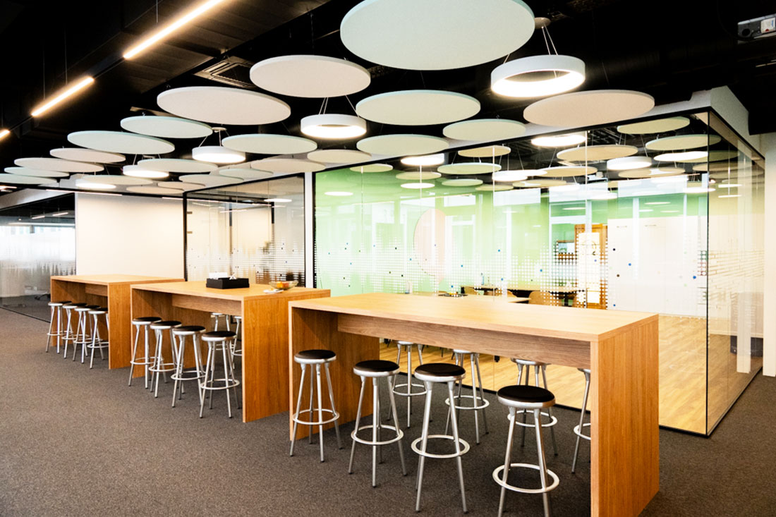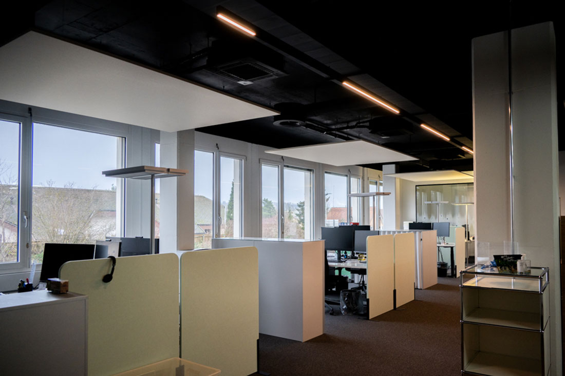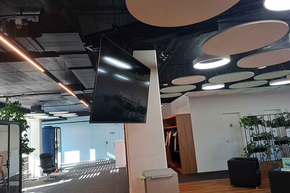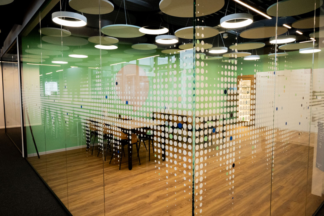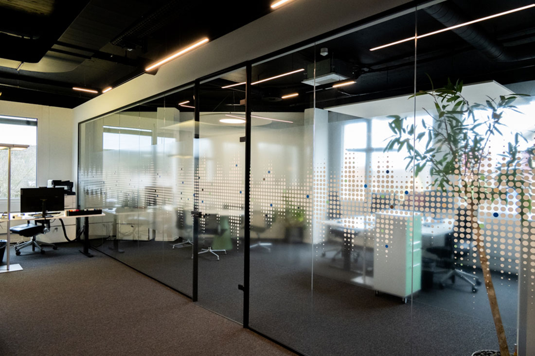 Mit Sicht- und Hitzeschutzfolien an den Glasflächen sowie einer ausgewogenen Kombination aus Arbeitsplatz- und Akzentbeleuchtung setzten wir die letzten Highlights. So entstand ein Arbeitsumfeld, das Funktionalität und Design vereint und den Nutzerinnen und Nutzern Raum für konzentriertes Arbeiten ebenso bietet wie für Begegnungen und Inspiration.