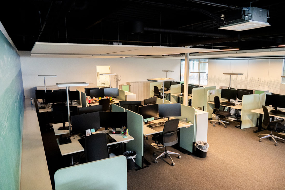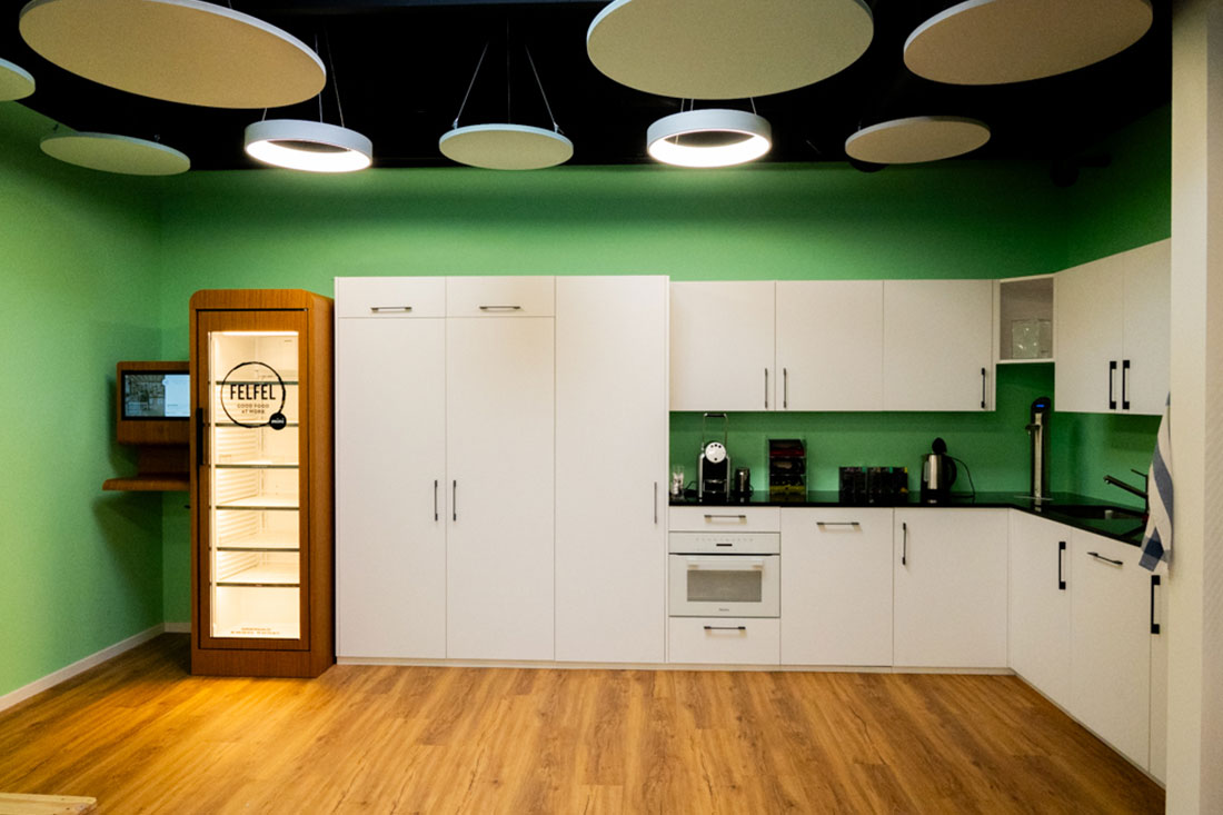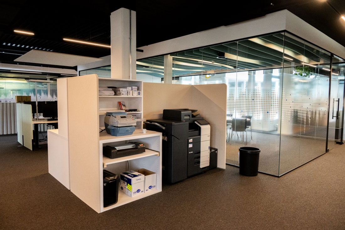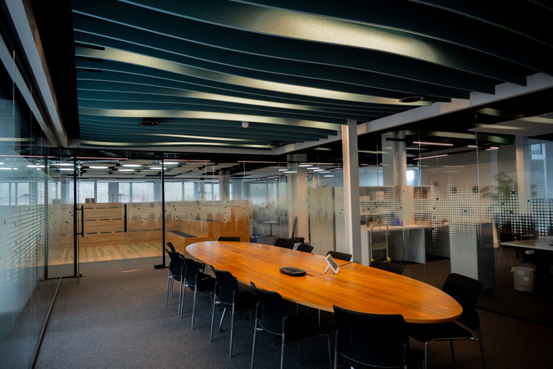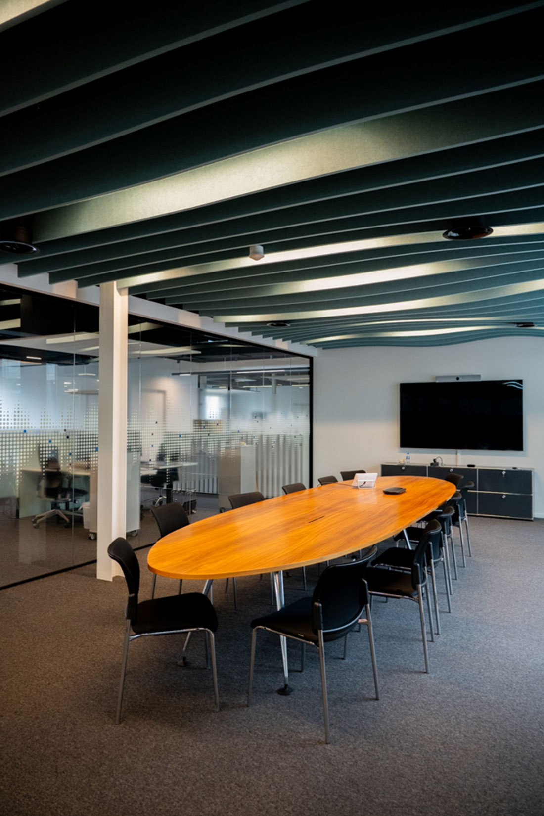Mit Sicht- und Hitzeschutzfolien an den Glasflächen sowie einer ausgewogenen Kombination aus Arbeitsplatz- und Akzentbeleuchtung setzten wir die letzten Highlights. So entstand ein Arbeitsumfeld, das Funktionalität und Design vereint und den Nutzerinnen und Nutzern Raum für konzentriertes Arbeiten ebenso bietet wie für Begegnungen und Inspiration.