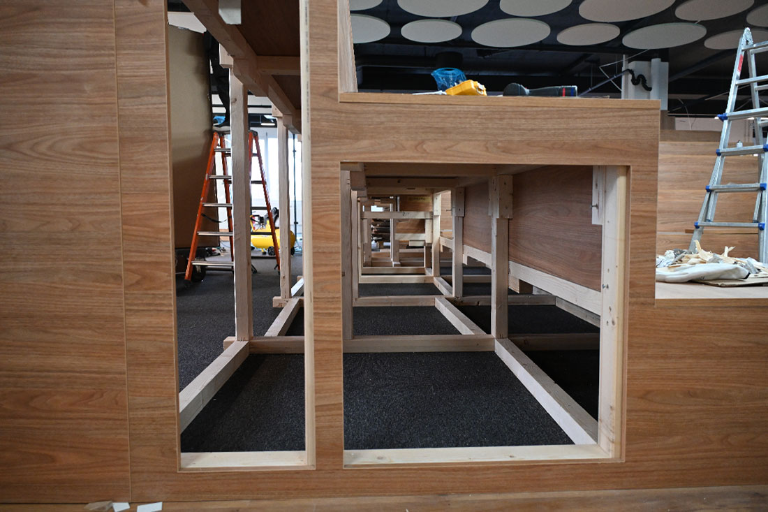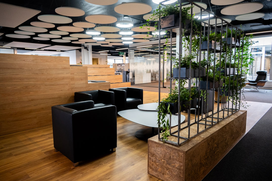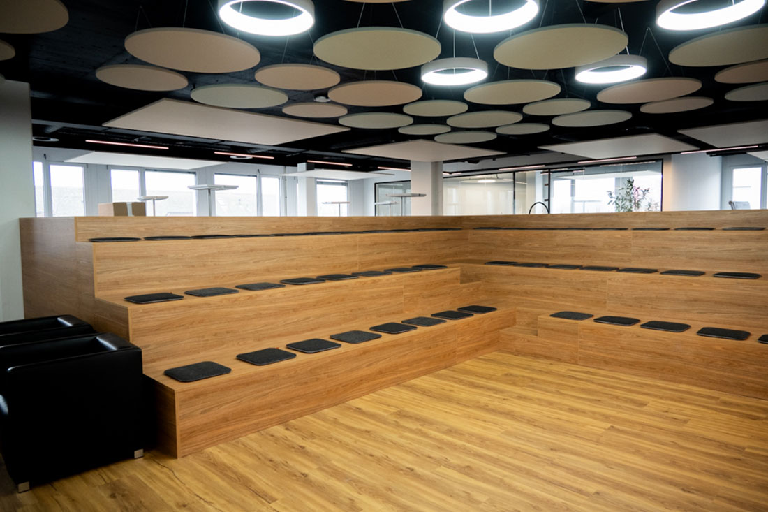 Die neue Raumstruktur verbindet Offenheit und Funktionalität: Glaselemente und Systemwände schaffen Transparenz, während integrierte Akustiklösungen für eine angenehme Ruhe sorgen. Ergänzt wird das Konzept durch eine funktionale Küche, gemütliche Rückzugsnischen und eine Arena, die als zentraler Treffpunkt für Austausch und Veranstaltungen dient.