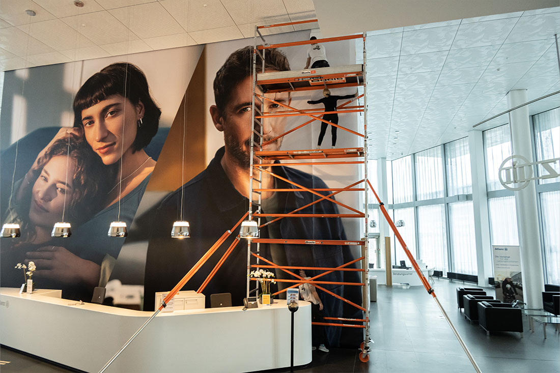 Massgeschneidert – wie die Versicherungslösungen der Allianz – waren auch die 10 bedruckten Bahnen, die von unserer talentierten Crew in fast 8 Metern Höhe und einer millimetergenauen Präzision verklebt wurden. Um so rascher wird aus einer Vision Realität. Vielen Dank dem Team der Allianz Suisse für die Chance, euch bei der Projektumsetzung zu unterstützen.